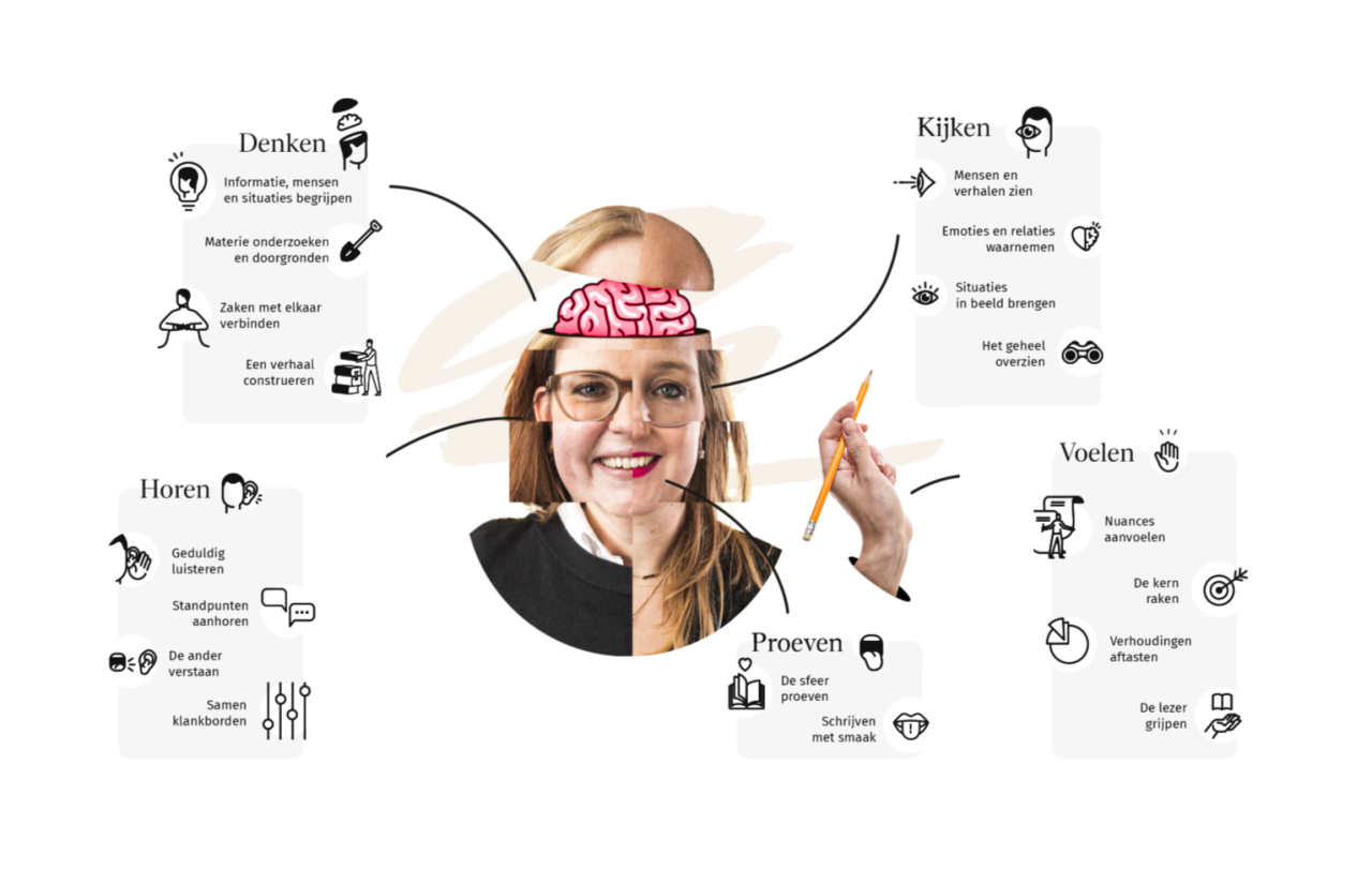 Schrijven is veel meer dan letters tikken. We benutten continu al onze zintuigen en ons brein om jouw boodschap scherp en treffend te verwoorden. Al deze waarnemingen vormen samen de basis voor onze schrijfkracht.
