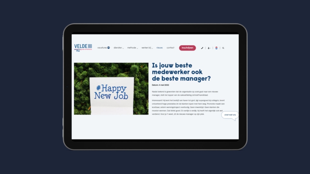 Het vinden van de beste kandidaten voor topfuncties in het bedrijfsleven is geen fluitje van een cent. Samen met de marketingcommunicatieafdeling van Velde maken we daarom inhoudelijke, triggerende en waardevolle artikelen en blogs. Om daarmee bewustwording te creëren over hoe succesvolle werving eruit moet zien. En te laten zien hoe je die ene persoon vindt die écht bij de organisatie en de ambities past. Bij elk artikel starten we met een interview van een Velde-expert en bronnenonderzoek. Vervolgens schrijven we zelfstandig een krachtig inhoudsartikel met een passende tone of voice voor de website van Velde.