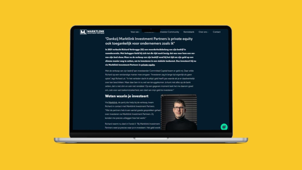 Marktlink Investment Partners helpt individuele investeerders te beleggen buiten de beurs om. Voor veel ondernemers is dit nog onbekend terrein en het gaat vaak om veel geld. Goede referenties zijn in deze wereld dus belangrijk. Wij deden ons huiswerk en zorgden dat we op ondernemersniveau met de investeerders konden praten over private equity, growth capital of venture capital. In een tijdsbestek van een maand interviewden we vijf drukbezette investeerders. Soms waren ze wat terughoudend; vermogen is natuurlijk een privéaangelegenheid. Daar gingen we integer mee om. En in de uitwerking zochten we telkens naar de juiste balans tussen een persoonlijke en een zakelijke toon.
