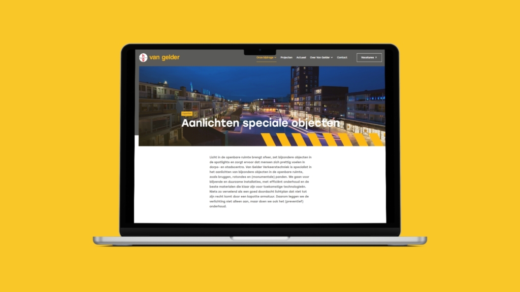 Van Gelder verbetert en moderniseert de openbare ruimte. Dat is nodig: de energietransitie, klimaatverandering, groeiende bevolking en meer verkeer vragen om veilige en voldoende infrastructuur. Het familiebedrijf – één van de grootste van Nederland – werkt aan wegen, bruggen, viaducten, kabels, leidingen, energienetwerken en openbare verlichting. Daar vertellen ze graag over op een toegankelijke en inspirerende manier. Wij voelden ons meteen onderdeel van de Van Gelder-familie en houden via een tweewekelijks overleg met de communicatieprofessionals een vinger aan de pols. Voor elk artikel spreken we trotse medewerkers, waarna we hun verhaal omzetten in teksten voor personeelsmagazine, nieuwsbrief, jaarverslag en website. En daar steken wij en de lezer nog wat van op ook!